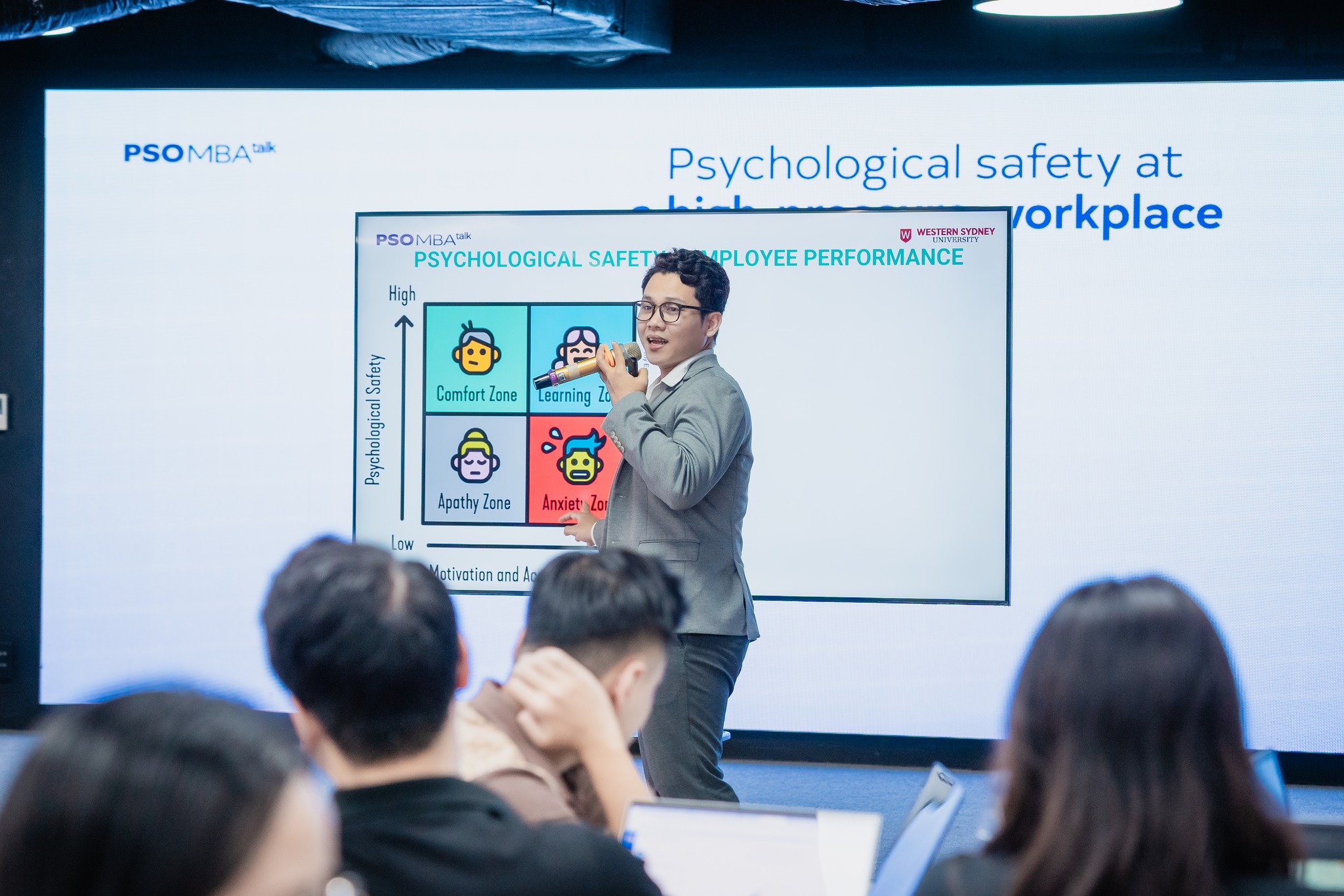 Dưới sự điều phối của TS. Lê Thị Thanh Xuân – ISB Lecturer, học viên PSO MBA đã có buổi thảo luận đầy cảm hứng về vai trò của an toàn tâm lý trong môi trường làm việc áp lực cao, từ góc nhìn thực chiến của Mr. Phạm Thạch Phú Tân – Head of Talent L&OD cum Strategic HRBP, Talentnet và Ms. Nguyễn Hà Trang – HR Director, L’Oréal Việt Nam.